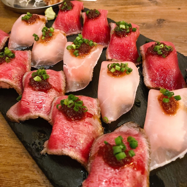 海鮮のお寿司でも十分豪華ですが、さらに豪華に肉寿司という選択肢もあります。
